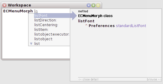 Levente Uzonyi is obviously one of a number of people who have been quite envious of the built-in tab-completion in Pharo, so he’s put in the work required to make OCompletion work on Squeak images again. OCompletion works in two ways: it offers a short list of automatic completion hints as you type based on your recent activity, or you can bring up the fuller (classic eCompletion) list by using the tab key, and use the up and down arrow keys to navigate the list and the right arrow to reveal syntax-highlighted source code for the methods listed.